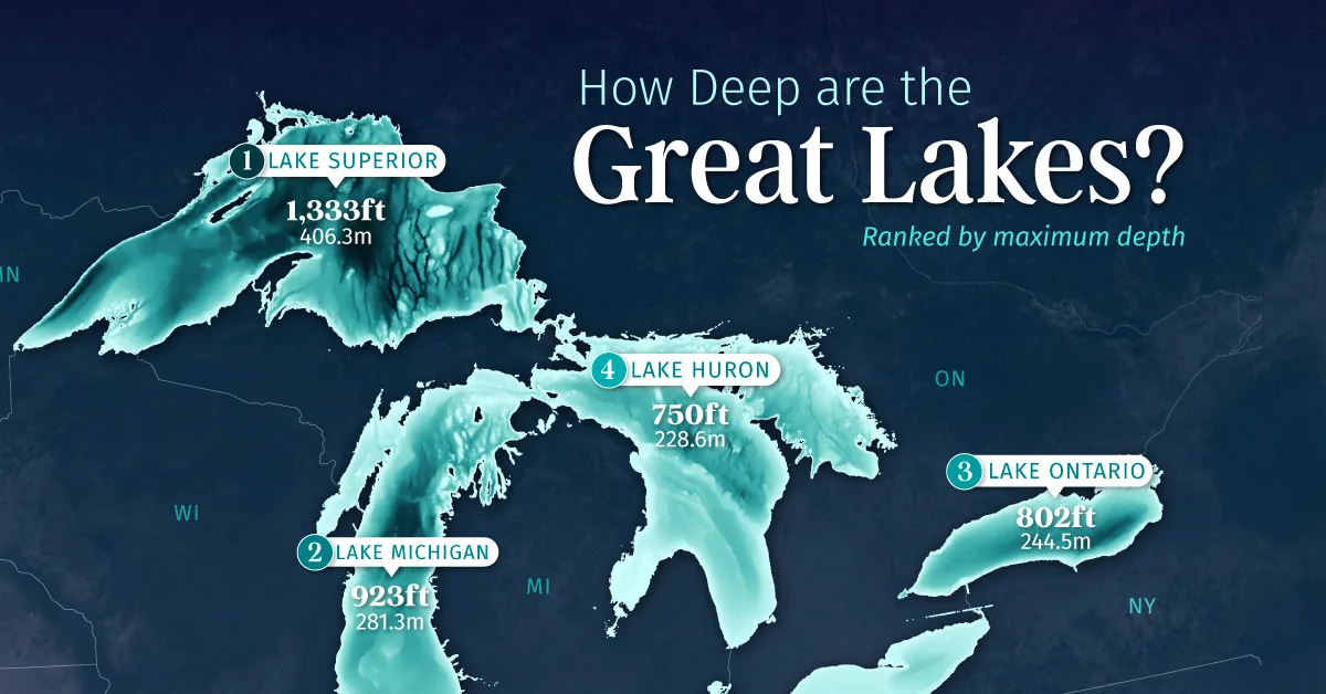 This visualization maps the maximum depth of each Great Lake, highlighting dramatic contrasts shaped by glaciers, geology, and time.