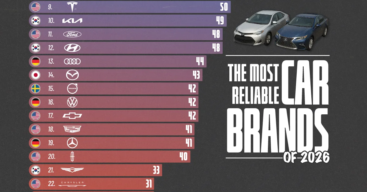 • Toyota, Subaru, and Lexus top the 2026 rankings, reinforcing Japan’s long-standing reputation for vehicle reliability.