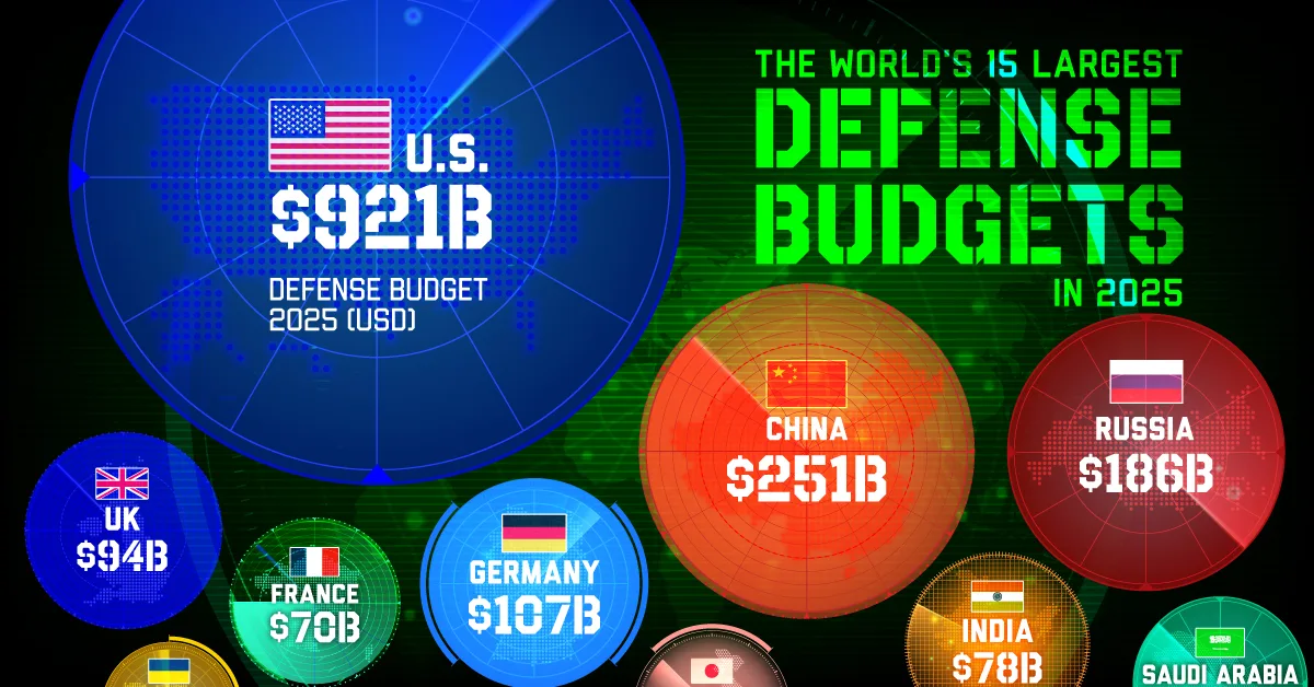 Bubble graphic showing the world's 15 largest defense budgets by country in 2025.