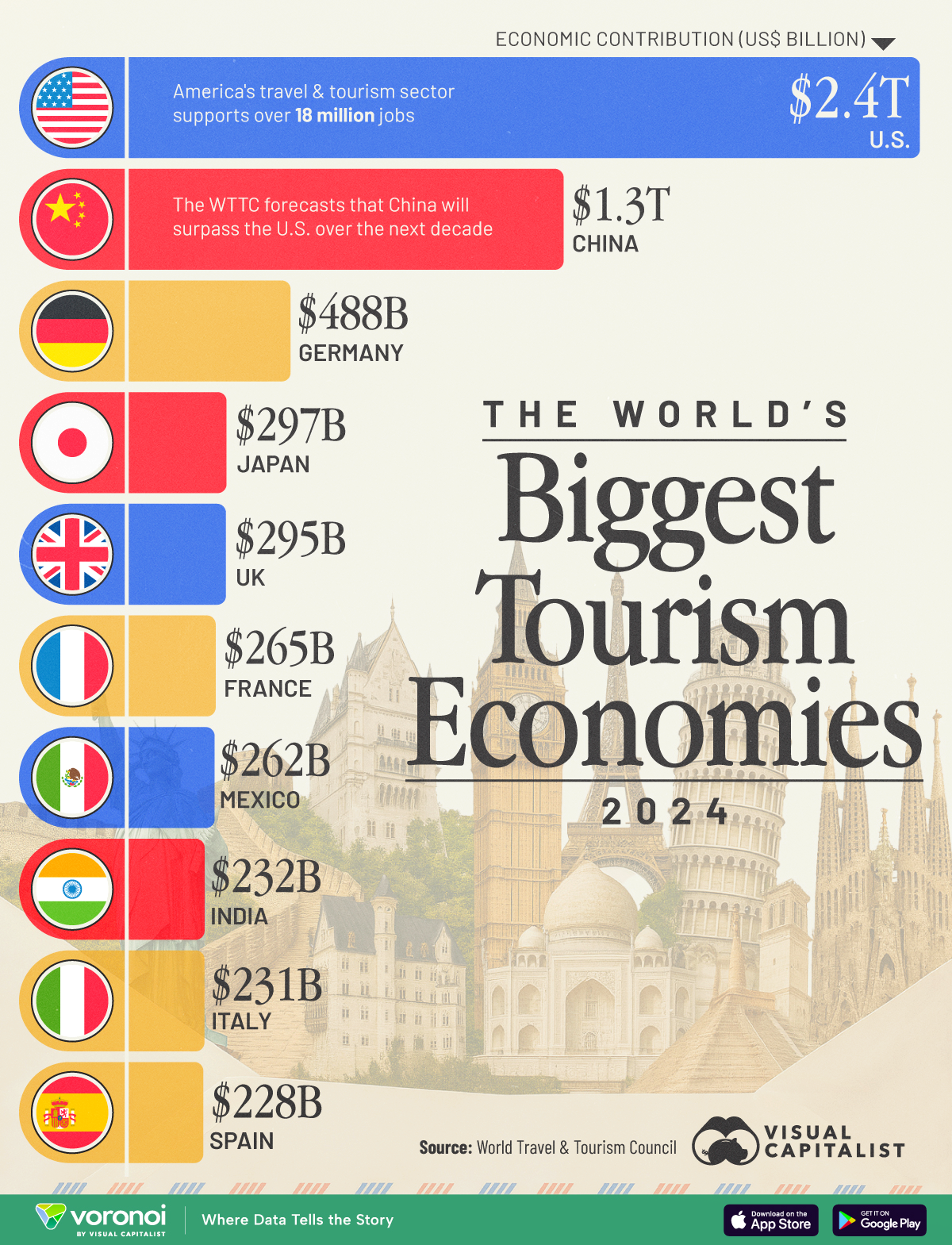 The data for this visualization comes from the World Travel & Tourism Council (WTTC). It shows the total economic contribution of each country’s tourism sector in 2024, measured in U.S. dollars.