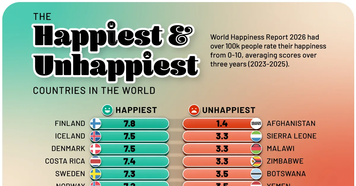 This graphic uses data from the 2026 edition of the World Happiness Report to show the happiest and unhappiest countries in the world.
