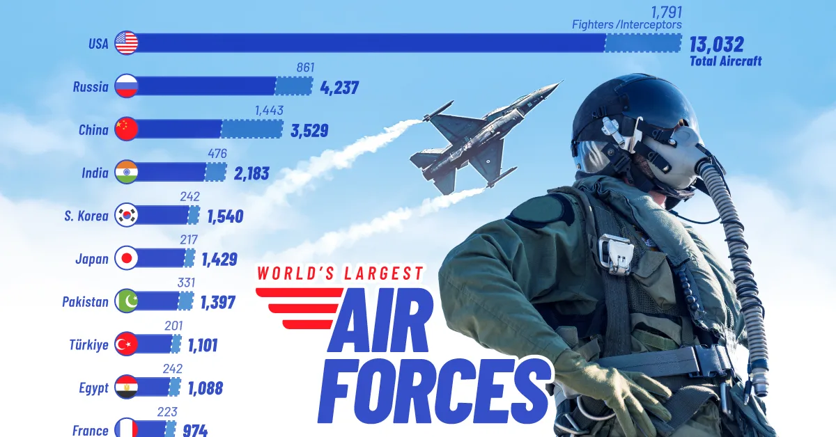 This chart ranks the world’s largest air forces in 2026 by total aircraft, revealing a massive gap between the United States and every other country. It also breaks out fighter and interceptor fleets, offering a closer look at frontline combat strength.