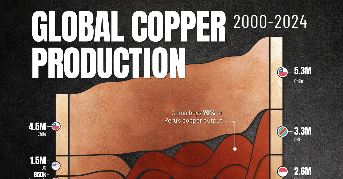 This chart ranks countries based on annual copper production from 2000 to 2024 and highlights important shifts for producers like China, Peru, and the DRC. The data for this visualization comes from the U.S. Geological Survey.