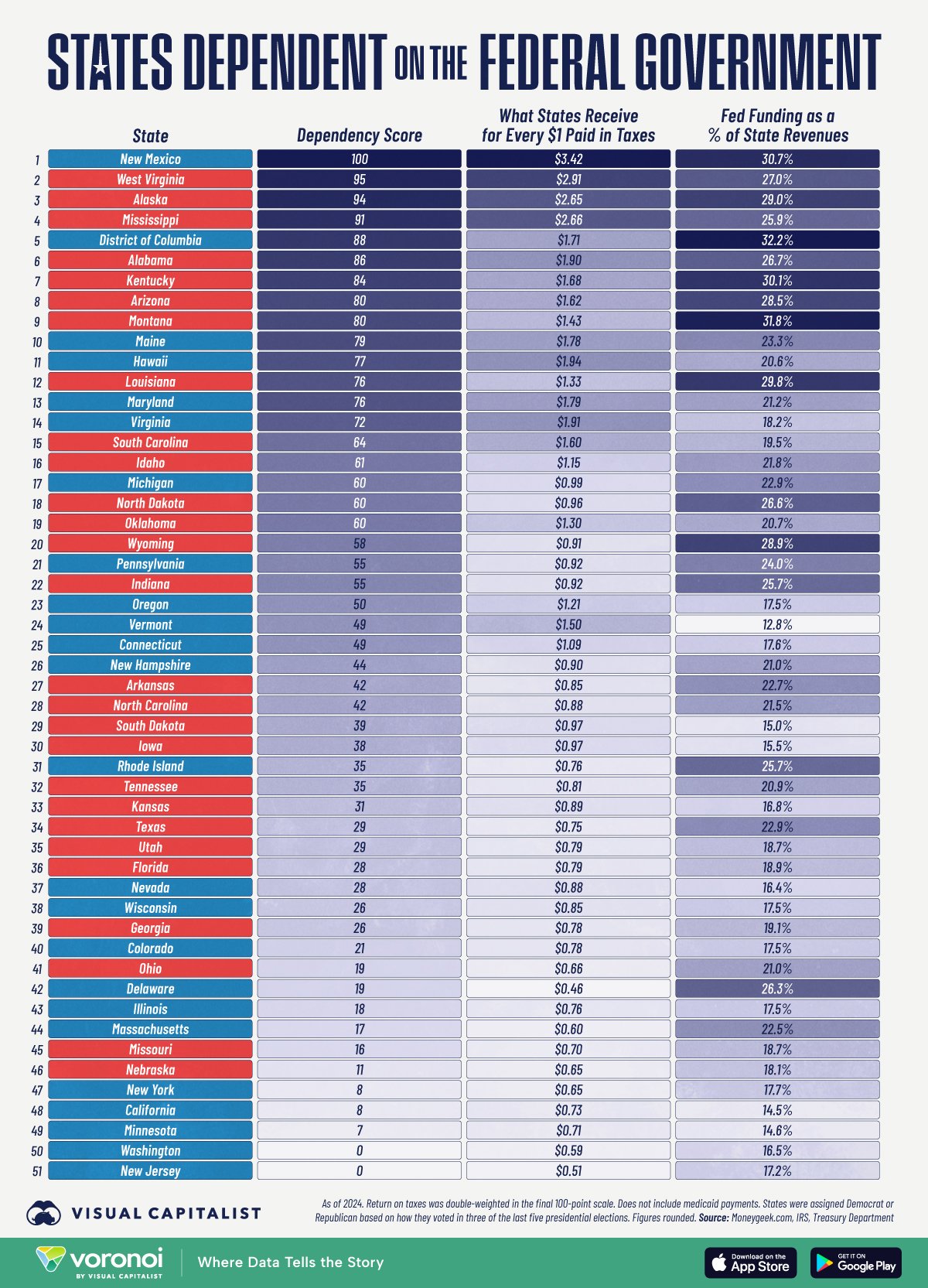 | Rank | State | Political Affiliation | Dependency Score | Return on Taxes | % of State Revenues From Federal Funding |