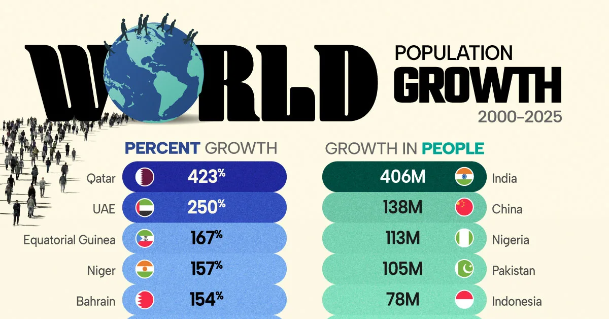 The data reveals a key split: countries leading in percentage growth are often smaller economies, while those adding the most people are already among the world’s most populous.