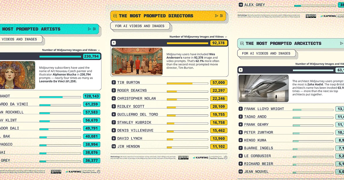 To find out, Kapwing, in partnership with NeoMam Studios, analyzed the Midjourney Discord to see how many times popular artists, architects, and directors were named in close to five million user prompts. This dataset reveals which creatives are influencing the aesthetics of AI-generated images and videos today.