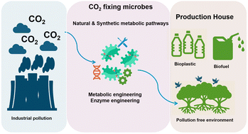 Engineered microbes utilize natural and synthetic pathways to capture industrial CO2 emissions. The assimilated carbon is transformed into bioplastics and biofuels, contributing to a cleaner and sustainable environment.