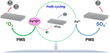In PMS/Fe2+, high-valent Fe(IV is generated, which converts PMS to singlet oxygen (1O2) and sulfate radicals (SO4˙−). These reactive species oxidize Ag0 to soluble Ag+, enabling rapid and efficient silver leaching from end-of-life silicon solar cells.