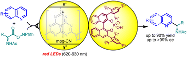 Graphitic carbon nitride with chiral Brønsted acid enables red-light-driven enantioselective Minisci reactions on heteroarenes, featuring broad substrate scope, recyclability (10 cycles), and sustained reactivity/selectivity.