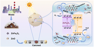 This work transforms electric arc furnace dust into a ZnFe2O4/ZnO Z-scheme photocatalyst. The synergy of oxygen vacancies and heterojunctions boosts charge separation for superior tetracycline degradation.
