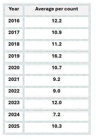 On average, participants recorded 10.3 butterflies during each 15-minute count. While a marked improvement on last summer’s record low of just 7, it is only broadly average by modern standards, and has done little to reverse longer-term declines.