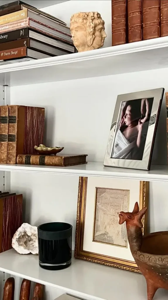 - Layer art: Small framed prints or photos leaned against the back of a shelf create depth.