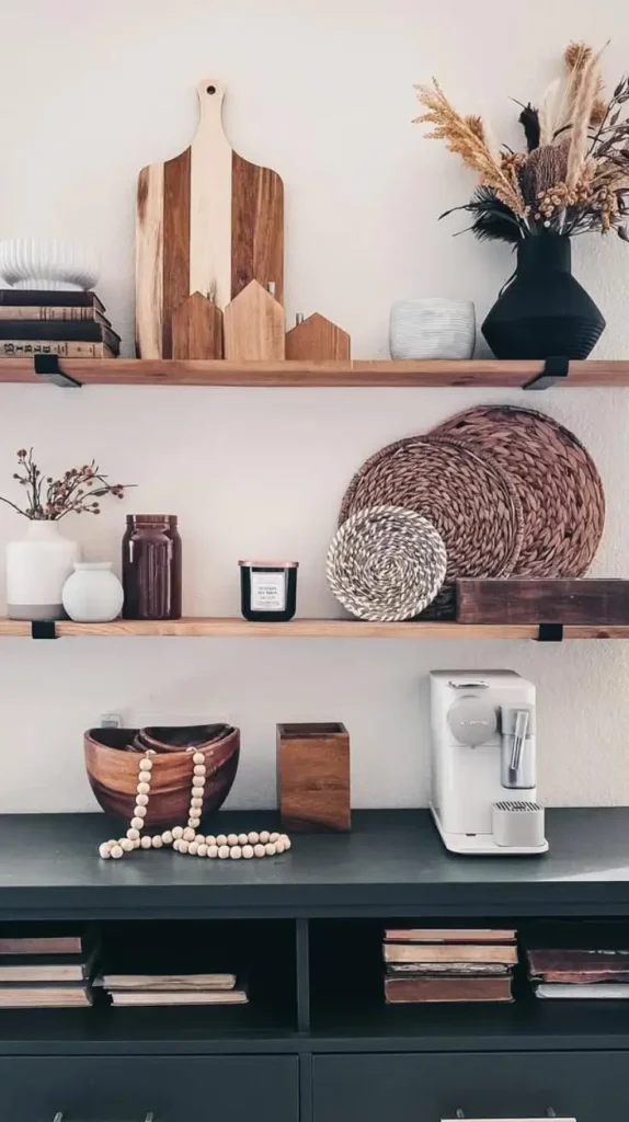 - Rustic wooden shelves: Add farmhouse warmth and character with natural textures.
