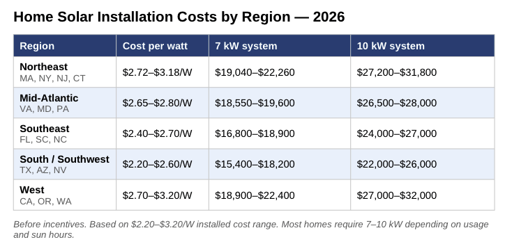 As of early 2026, the national average installed cost for a residential system runs approximately $2.50–$3.50 per watt before incentives, according to EnergySage’s marketplace. Actual prices vary significantly by region, and many states offer additional tax credits.