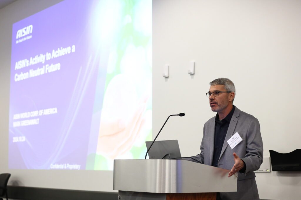 - Mark Greenawalt (Aisin) presented an overview of Aisin’s sustainability and carbon neutrality goals and shared case studies on projects Aisin has implemented in the region to drive progress on carbon reduction.
