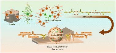 A bio-based waterborne adhesive is developed from high-phenolic lignin, HMF, and a flexible CO2-based isocyanate-terminated copolyester oligomer, forming robust networks with high bonding strength (>16 MPa), weather resistance, and recyclability.