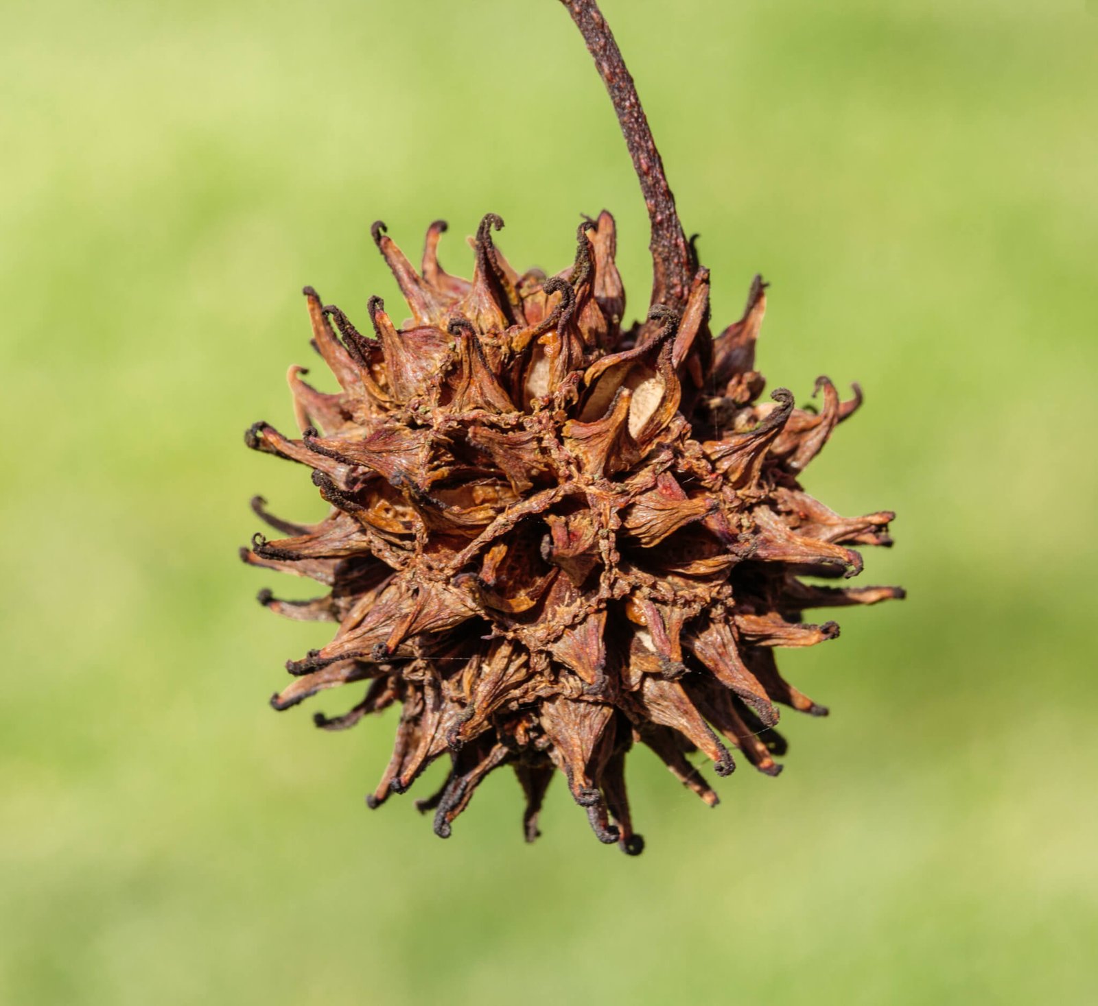 Sweetgum is an easily identified species. The leaves (as previously stated) are vivid green when newly grown and star-shaped. In the fall, the leaves turn orange, yellow, red, or purple, and make for a stunning display of color. Fully matured trees can reach upward of 80 feet and have a broad, conical, and rounded crown. Matured fruits are quarter-sized and appear as spiky green balls that drop when they turn brown and harden. For those who grew up around this tree (myself included), these trees are a childhood favorite because the fruits make perfect launchers for kids to throw at their siblings and friends. But it takes a sweetgum tree 20 to 30 years to reach enough maturity to begin producing fruit, so “launchers” are only available in older trees.