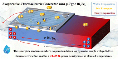 We overcame low power limitations using a novel hybrid evaporative–thermoelectric generator. This sustainable synergy yielded 11.37 W m−2 (31.45% increase) at 100 °C with a p-Bi2Te3 device.