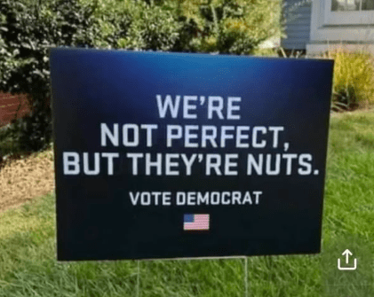 The lawn sign here reminds me of the American political rhetoric over the past decade, where people have been saying, “The Democratic platform needs to be more than ‘Were not insane Republicans.’” I remember thinking: I’m not too sure about that.