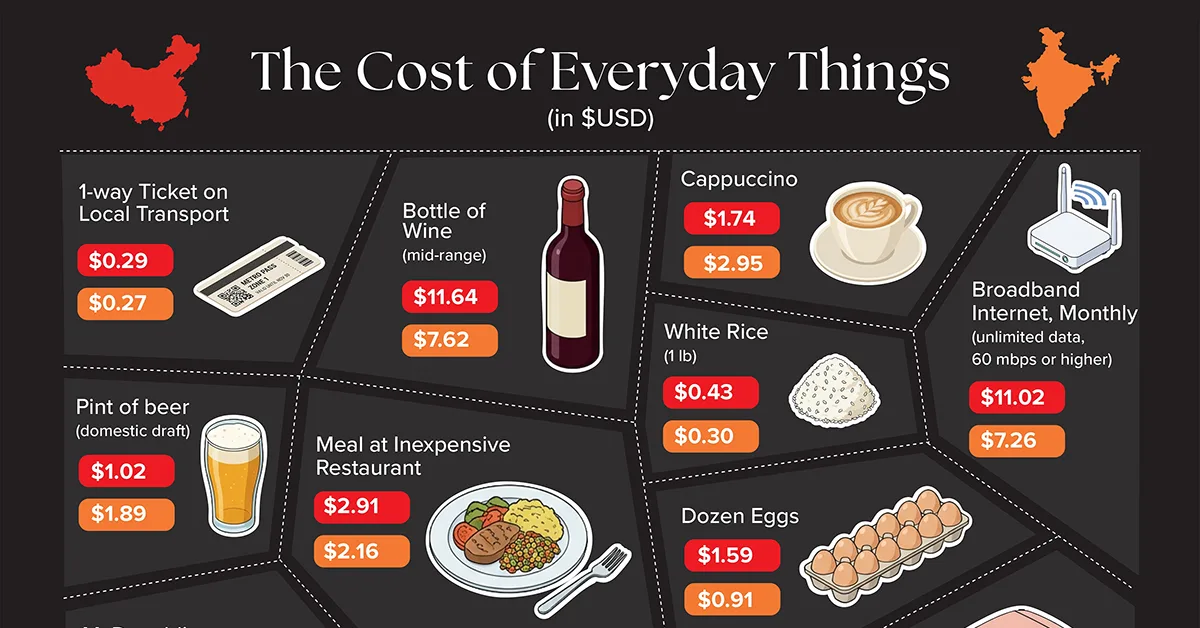 This graphic compares everyday prices across the world’s two most populous countries, from a $0.30 transit ticket to a $2–$3 restaurant meal. While India is consistently cheaper across most categories, China’s significantly higher wages change how affordable these prices feel in practice.