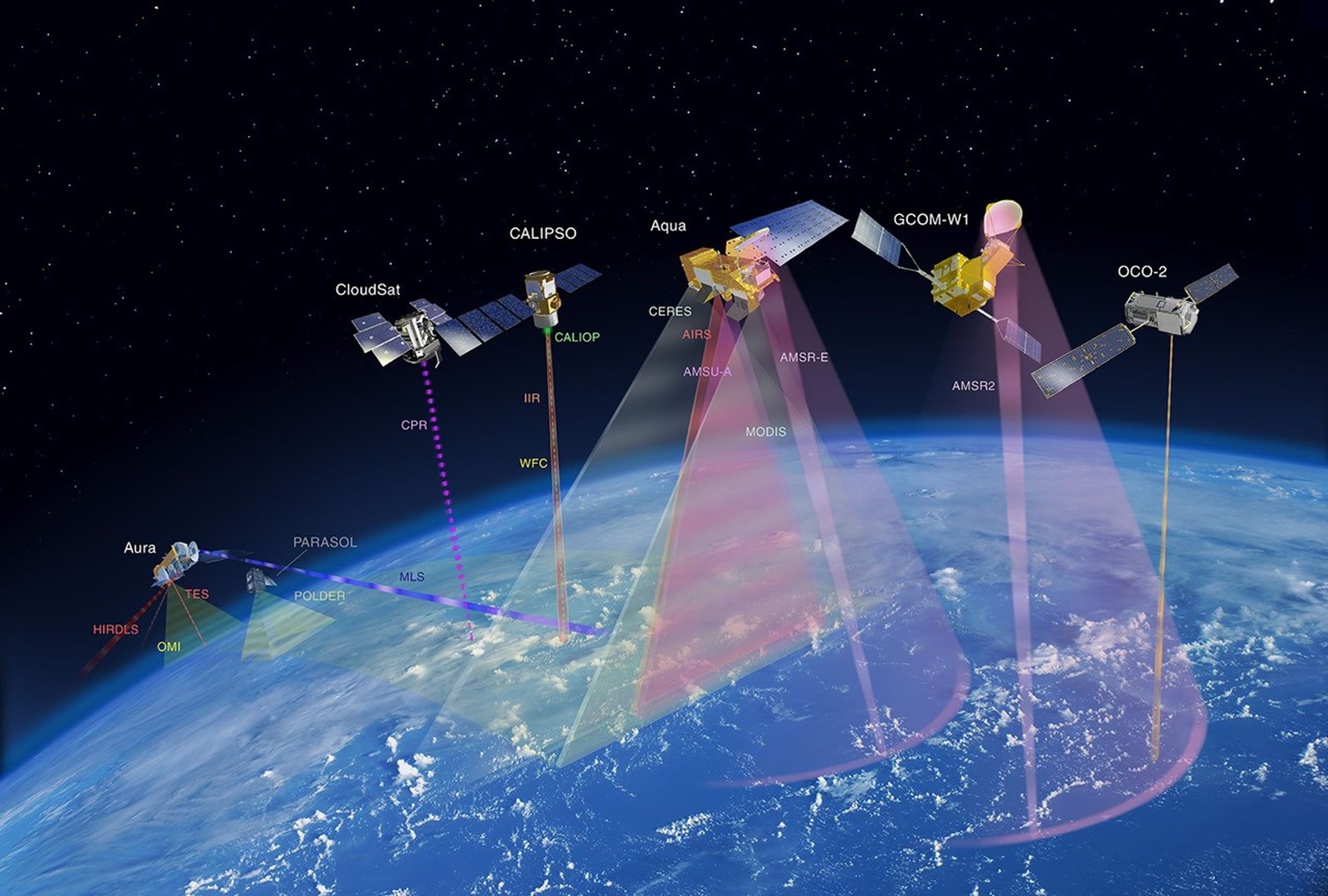 Figure 5. An artistic depiction of all the satellites that participated in the Afternoon Constellation (A-Train), except for Polarization and Anisotropy of Reflectances for Atmospheric Sciences coupled with observations from a Lidar (PARASOL). CloudSat and Cloud-Aerosol Lidar and Infrared Pathfinder Satellite Observations (CALIPSO) lowered their orbits. Called the C-Train, the orbit of these satellites overlapped the A-Train, enabling science observations with other A-Train missions. More details about the A-train is available on the constellation’s website.
