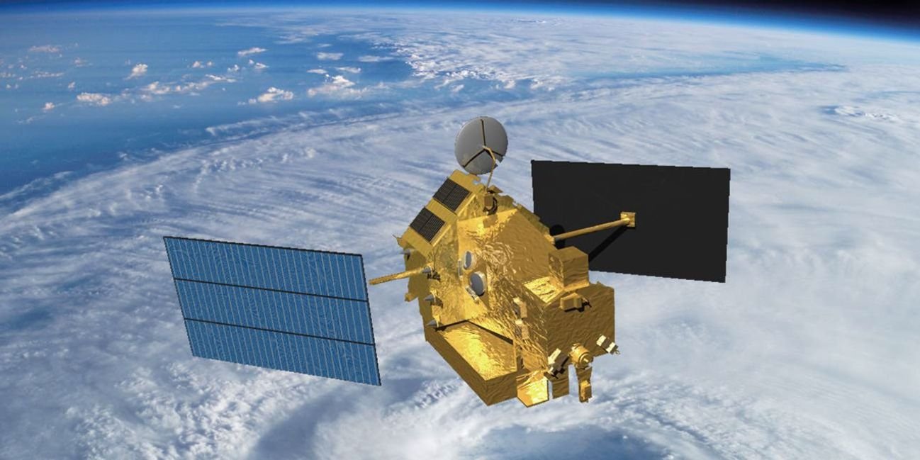 Figure 9. Artistic rendering of the Tropical Rainfall Measuring Mission (TRMM) in space over a hurricane. TRMM was launched in 1997 and remained in operation until 2015. The satellite was designed to improve our understanding of the distribution and variability of precipitation within the tropics as part of the water cycle in the current climate system.