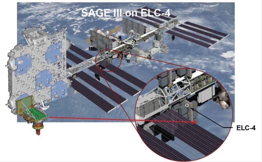 Figure 11. An artistic rendering of the Stratospheric Aerosol and Gas Experiment-III (SAGE-III), which is externally mounted on the International Space Station’s Japanese Experiment Module–Exposed Facility (JEM-EF) EXPRESS Logistics Carrier (ELC)-4. SAGE III/ISS measures the vertical structure of aerosols, O3, water vapor, and other important trace gasses in the upper troposphere and stratosphere.