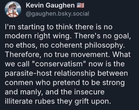 I disagree. Though he has a point to make about ripping off the “illiterate rubes,” there is a clearly laid out goal to today’s right wing, as articulated in “Project 2025.”