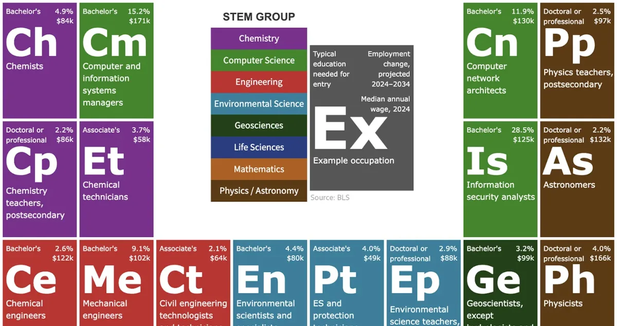To show how these careers relate to one another, the U.S. Bureau of Labor Statistics (BLS) created a “periodic table” of STEM occupations. The visual groups jobs into eight major fields and highlights projected employment growth (2024–2034), median wages, and typical education requirements.