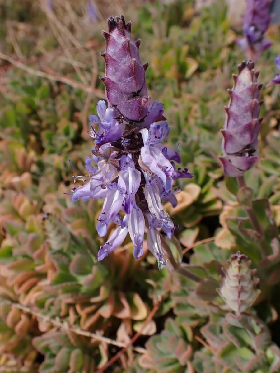 In spite of its obnoxious odor, Coleus canina (or Coleus caninus) is an attractive plant. It’s a tidy bush with luscious foliage of scallop-edged, grey-green leaves. In the summer, the bush bears blue flowers. It’s the leaves that cause the obnoxious smell but (usually) only when touched.
