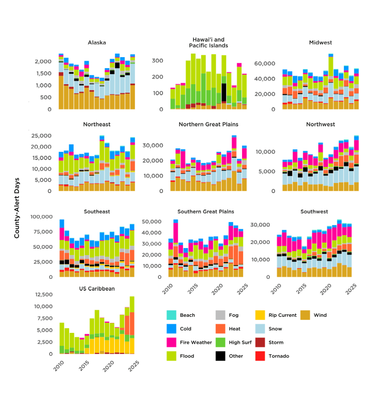I also grouped the alerts geographically according to the Fourth National Climate Assessment regions to show how different regions of the country face different kinds of extreme weather. Wildfires in the Great Plains, the Southwest, and the Northwest have prompted thousands of fire weather (also called “red flag”) alerts by the NWS; historically, alerts in the Southeast and the Northeast are mostly related to flood, cold, heat, and wind. The US Caribbean (that’s Puerto Rico and the US Virgin Islands) have faced floods, dangerous ocean weather and currents, and in the previous two years, extreme heat alerts that were not common before. Note that the small number of storms does not reflect their devastating impact, such as Hurricane María’s in 2017. Finally, Hawai’i and the Pacific Islands have faced much flooding and storms, and in the last few years have seen red flag weather alerts for wildfires such as the terrible Maui fires of 2023.