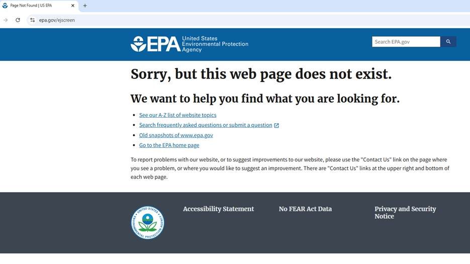 The removal of environmental justice data also eliminates powerful advocacy tools for community members fighting for environmental justice. One notable example is the Trump administration’s deletion of EJScreen from the EPA website on February 5, 2025. EJScreen was a mapping tool developed to help users identify areas where vulnerable people may be exposed to high levels of pollution. In 2023, when the site was still active, the Center for Public Integrity advised community members to reference EJScreen in discrimination complaints to the EPA, and community members successfully used it to advocate for environmental justice.
