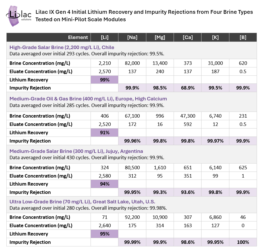 Table 1: Lithium and other impurities concentrations of the Lilac eluate with Gen 4 Lilac IX.
