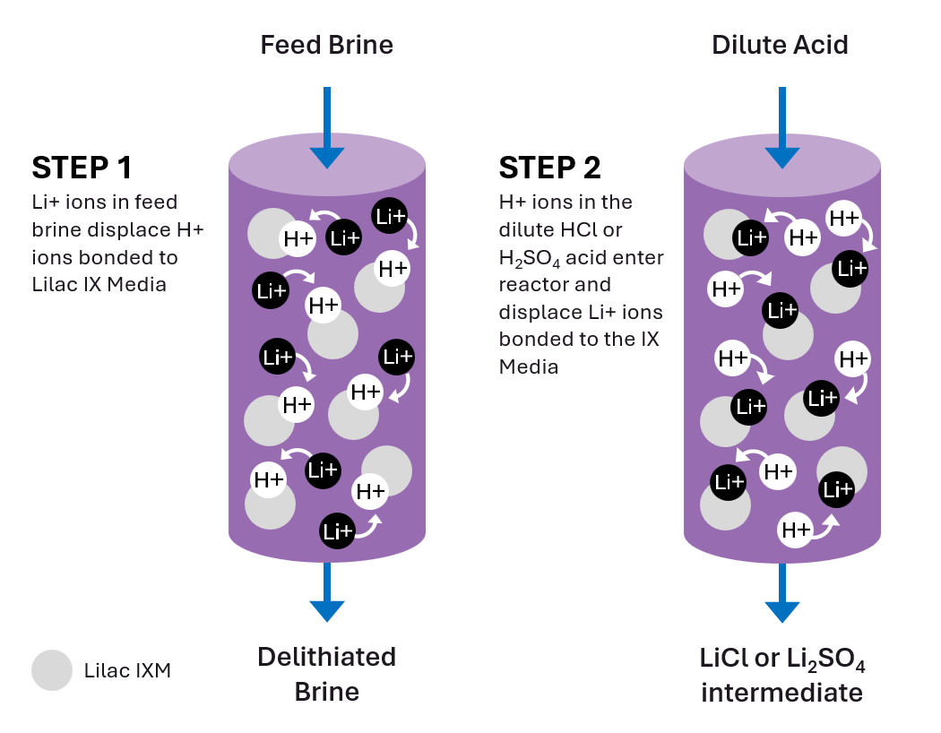 In Lilac’s process, raw brine from a salar, oilfield, geothermal, or other reservoir source passes through our ion exchange media (IXM). The Li+ ions in the feed brine displace the H+ ions bonded to the Lilac IXM. Once the IXM is fully loaded, we strip (or elute) the Li+ ions using a dilute acid, either hydrochloric (HCl) or sulfuric acid (H2SO4). To be clear, these are distinct steps; the lithium-depleted brine is reinjected or disposed of without contacting acid.