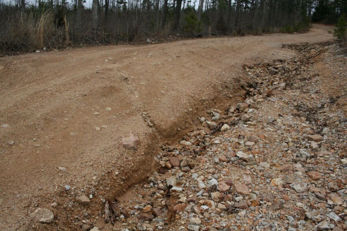 A dirt road with a foot-deep trench carved by the rain. Photo courtesy of Jaeger Everett//Insteading