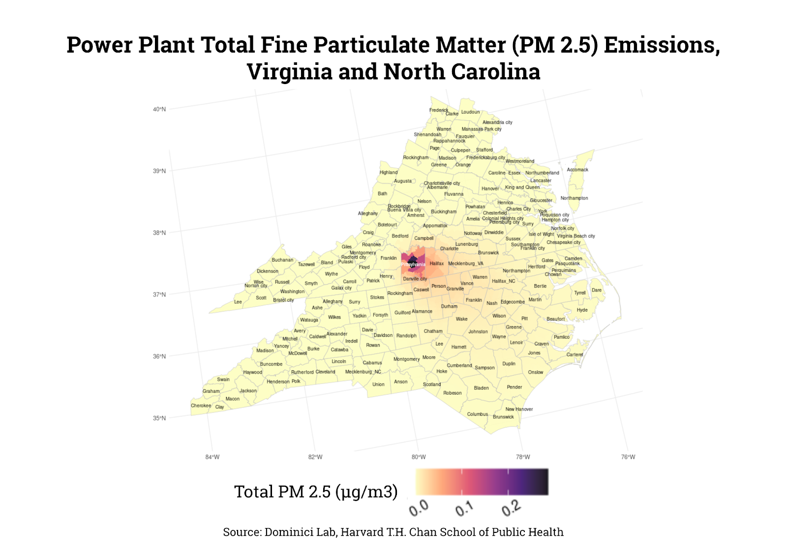 In Pittsylvania County, around 17,500 people, or more than 1 in 4 county residents, would face levels of exposure associated with increased hospitalizations due to heart attack, pneumonia, cardiovascular issues, and, in severe cases, stroke or cancer.