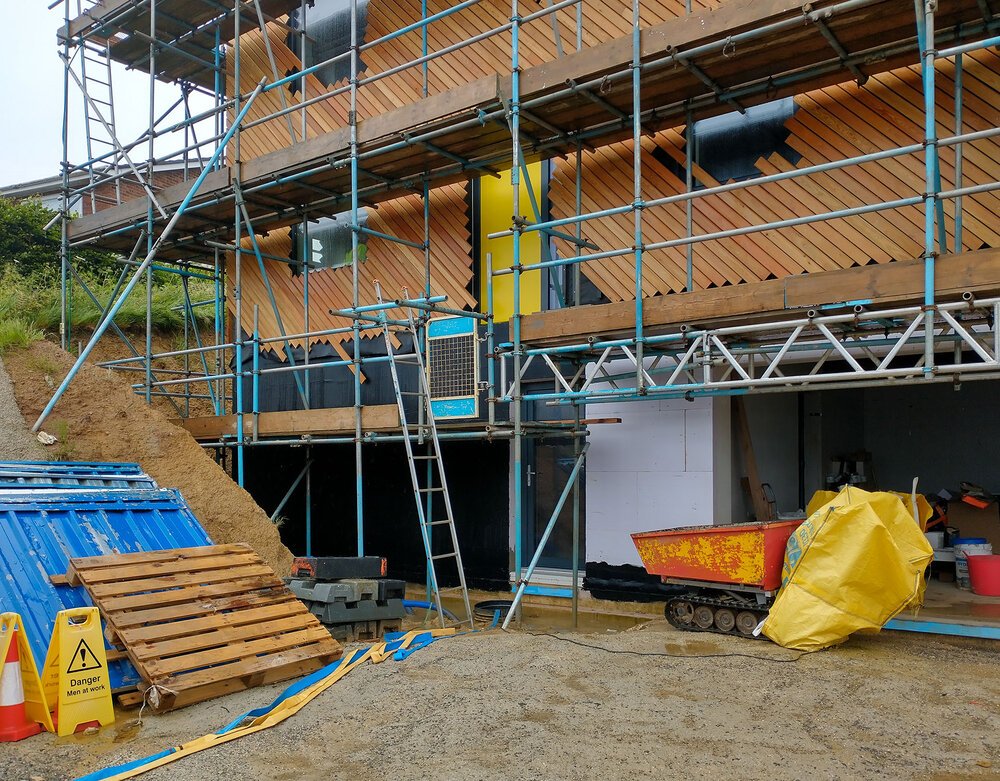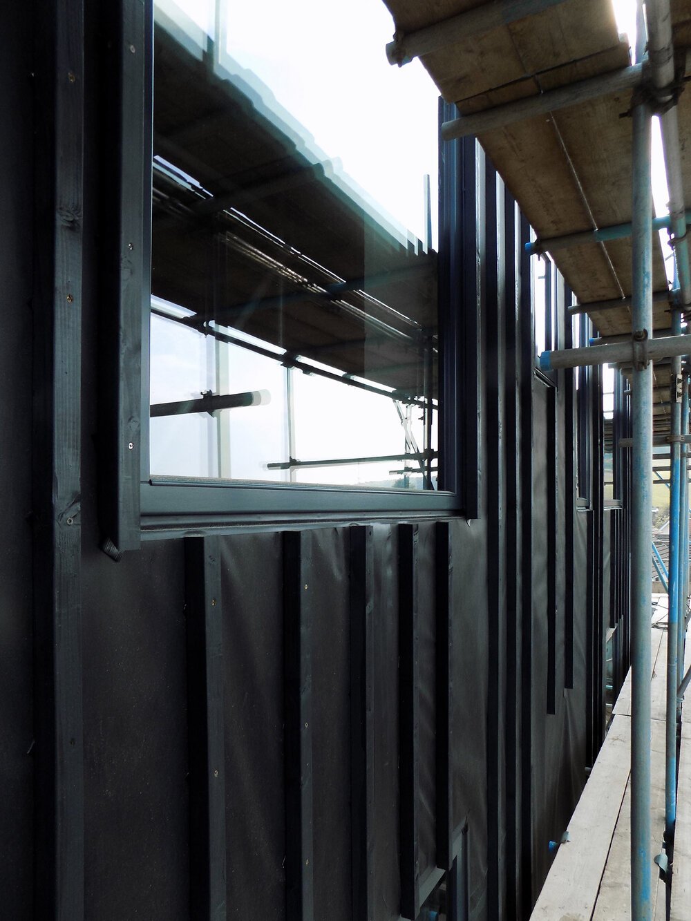 The diagonally coursed Siberian larch cladding is nearing completion at our ICF Eco-Home in Scarborough. The timber provides a low-carbon, elegant skin to the family home which will season to a palette of soft greys as the home weathers in.