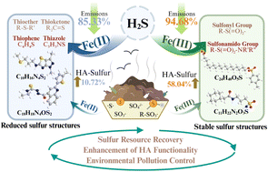 Fe(III) drives sulfur oxidation and stable fixation in humic acid, boosting sulfur–HA by 58.04% and slashing H2S emissions by 94.68%, while Fe(II) leads to unstable intermediates. This work aids sulfur pollution control and waste resource recovery.