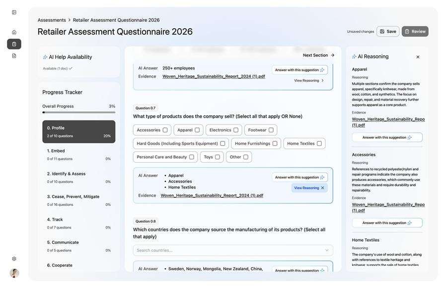 According to TrusTrace, a key feature of the new platform is AI-assisted completion, based on sustainability reports and existing documentation, which will allow brands to share responses with multiple retailers instantly. The platform also provides a data-driven mechanism to identify gaps, offering real-time results and tailored recommendations for effective remediation and corrective measures, TrusTrace said.