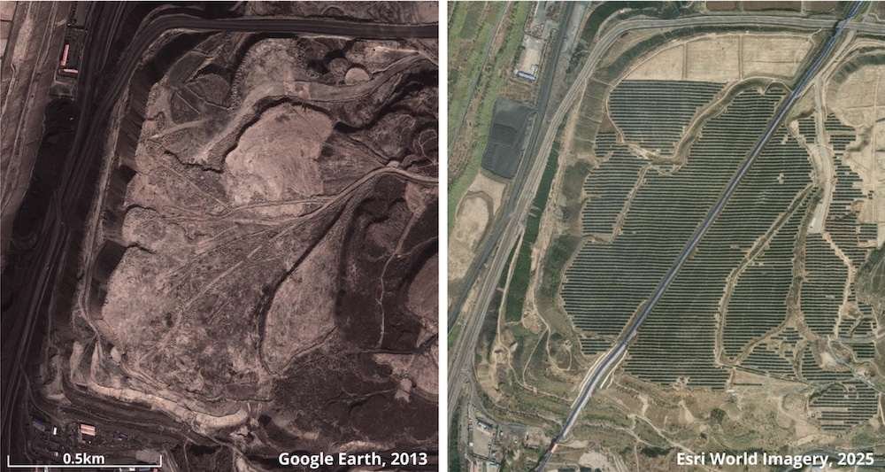 2013 and 2025 satellite images of part of the Pingshuo Mining Area, which houses two operating surface coal mines, in Shanxi Province, China. Solar under development on the degraded mining land is expected to generate 160 MW. Global Energy Monitor