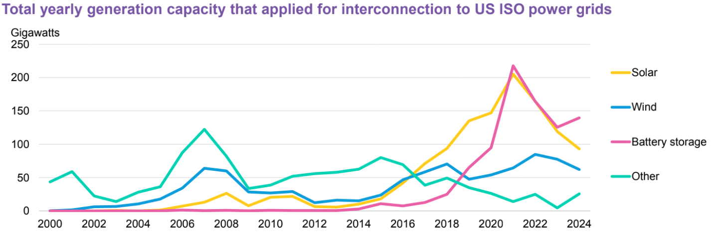 Interconnection also remains a key barrier to bringing new projects online as projects languish in a backlogged queue. New interconnection applications have slowed, but an estimated 93 GW of solar and 139 GW of storage capacity sought grid connection in 2024.