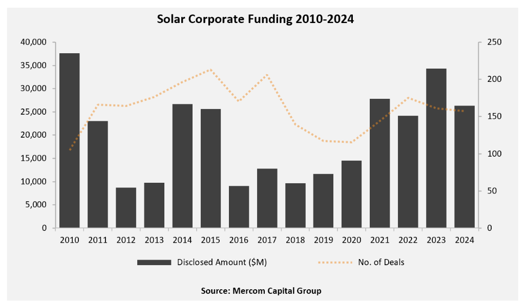 Announced debt financing came to $18.8 billion in 2024. Mercom Capital said securitization deals were a key contributor, with a record $5 billion in 16 deals. In 2024 a total 82 corporate M&A transactions were executed in the solar industry.