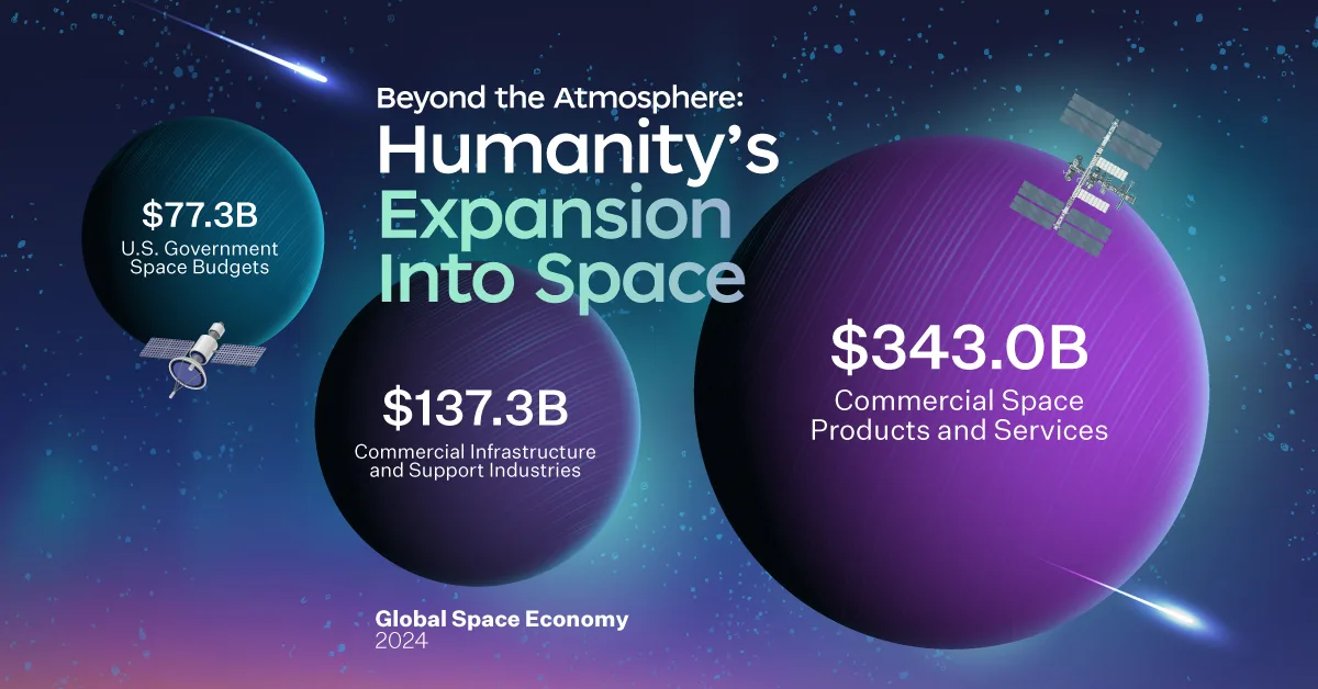 Commercial budgets currently far exceed government, with commercial space products and services ($343 billion) leading the way.
