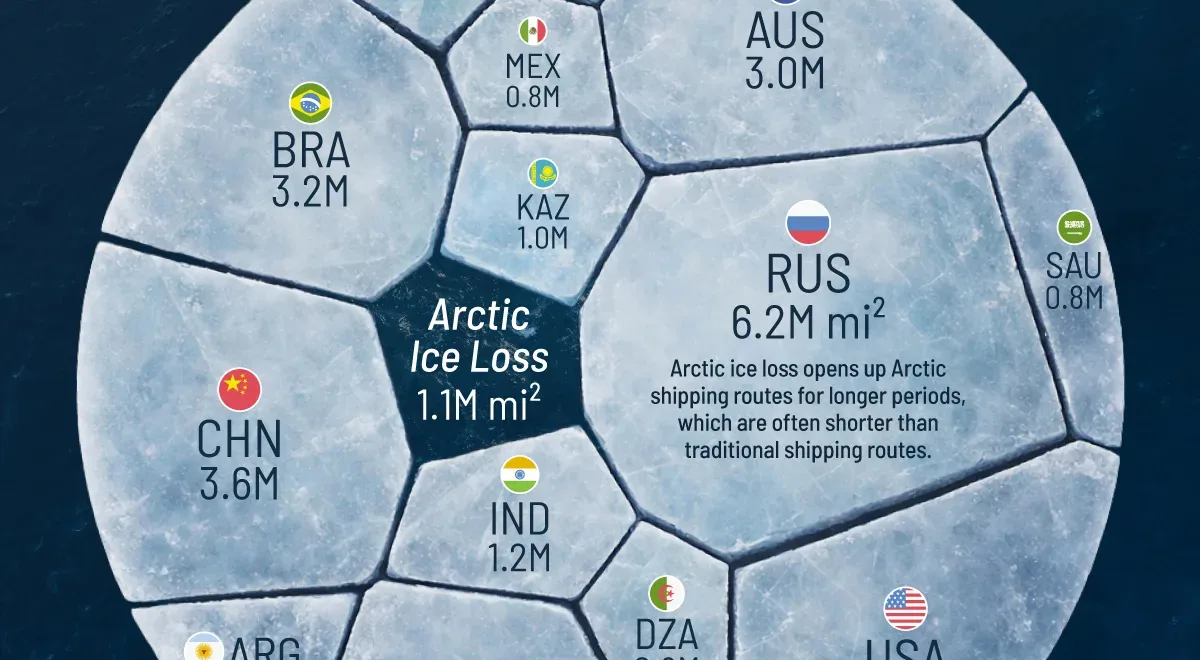 With such significant amounts of ice loss, these changes to the Arctic are opening up global shipping routes, which can be half as long as traditional routes.