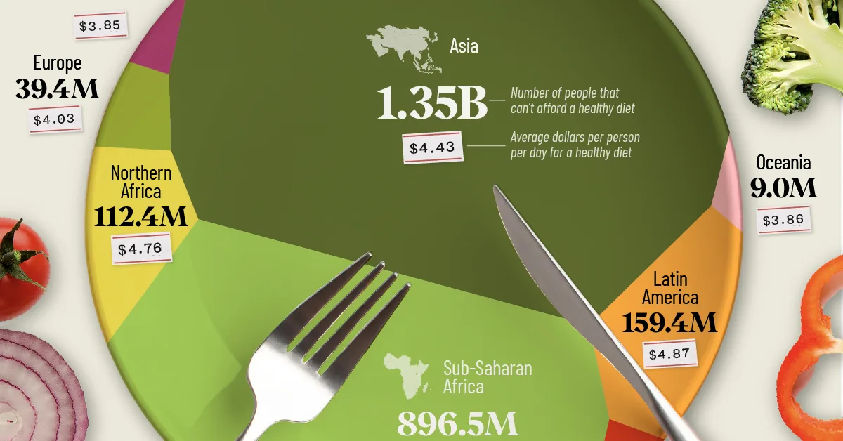 This infographic shows the daily cost of a healthy diet by region and the number of people who cannot afford one, based on the latest available data from the Food and Agriculture Organization (FAO). The costs are expressed in purchasing power parity (PPP) dollars to account for regional cost-of-living differences.