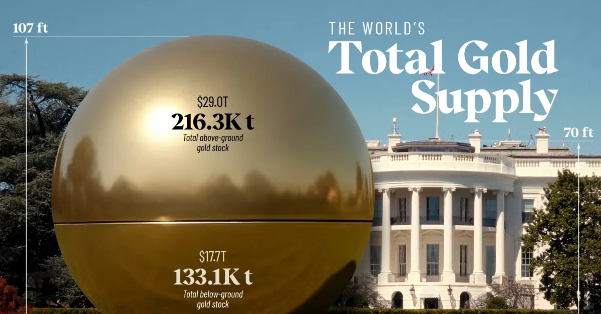 When including identified underground gold, the total reaches 348,375 tonnes. All of the world’s gold together in a sphere would be about 107 feet tall, matching the approximate height of the White House from the south side’s lawn to the top of its flagpole.