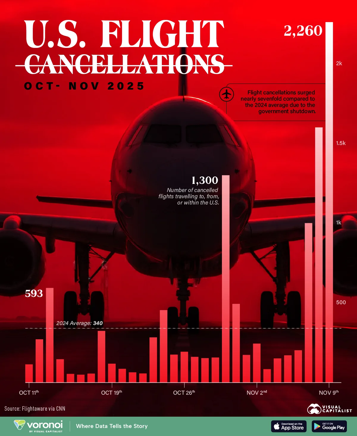 - During the longest U.S. government shutdown on record, flight cancellations jumped to 2,260 on November 9th, nearly seven times higher than the 2024 average.