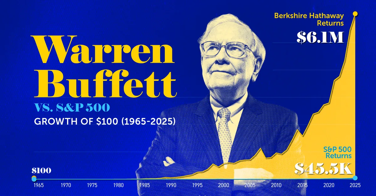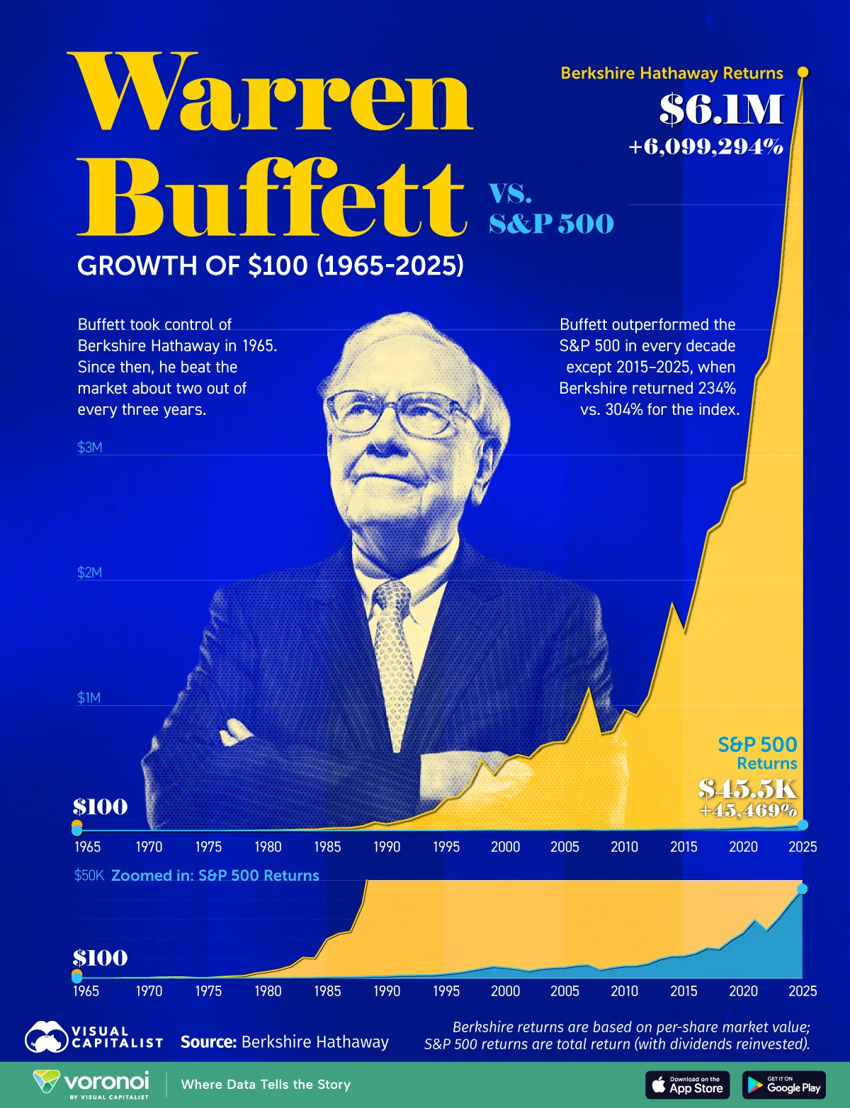 - A $100 investment in Berkshire Hathaway at the start of 1965 would be worth roughly $6.1 million by the end of 2025, versus about $45.5k for the S&P 500.