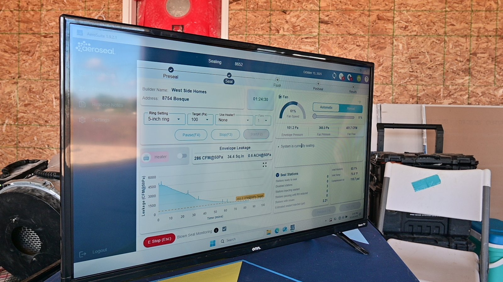 After prep and initial blower door test, it was time to start the seal. Everyone gathered around the monitor to watch as the seal began. The machine spun up, the lay flat inflated, and the stations started to seal. The sealing stations atomize the sealant, filling the home with a fog of sealant. Because the area is pressurized the sealant particles rush to escape through the leaks, finding any existing holes and cracks in the envelope and gradually accumulating to form a strong but pliable air-tight seal.