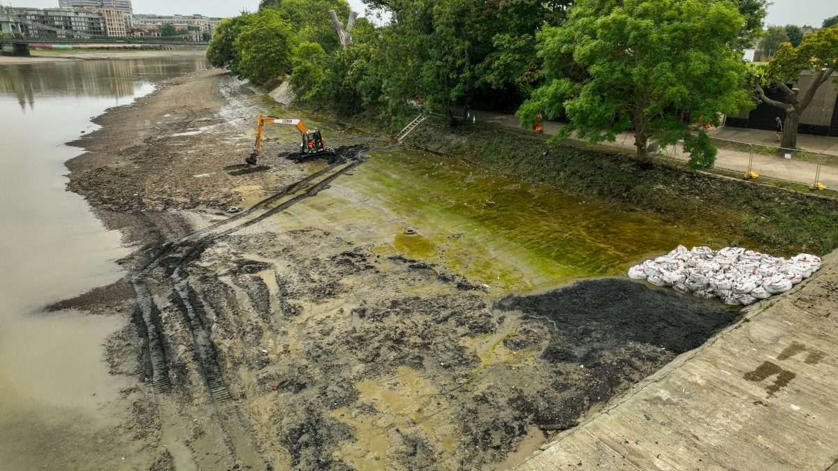 Excavation of ‘wet wipe island’, which has formed along a 250-metre stretch of the river near Hammersmith Bridge (image credit: Thames Water).